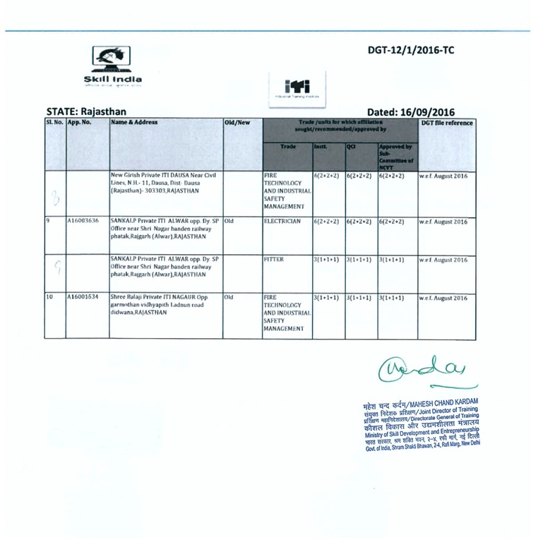 Name of the Institute | Sankalp Private Industrial Training Institute Rajgarh Alwar |